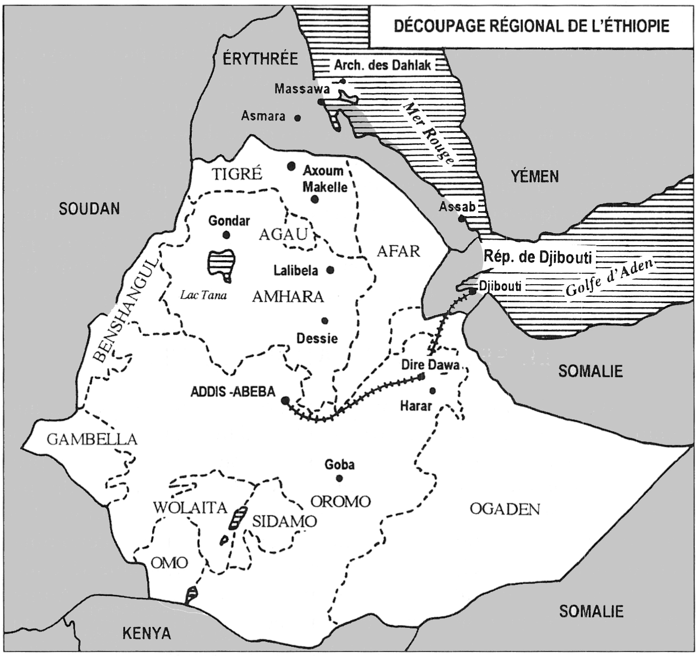 Aux XVIIe et XVIIIe siècles, l’Empire abyssin se fissure sous la pression des Oromos, un groupe de nomades hostiles au christianisme en provenance du Sud. Les empereurs ne parviennent pas à contrôler les provinces aux mains de puissants gouverneurs qui entrent souvent en rébellion contre le pouvoir central. Cette rivalité entre la capitale et la périphérie lointaine va demeurer une constante dans l’histoire de l’Éthiopie toujours à la recherche d’un ciment unificateur. L’établissement d’un tel lien national sera toutefois l’objectif de l’Église copte, malgré la défiance des communautés musulmanes. Il faudra attendre 1885 pour que le pays s’engage sur la voie d’une réunification. Sous le règne de Ménélik II, l’Éthiopie s’étend considérablement vers l’ouest, l’est et le sud. Le souverain offre ainsi à l’aristocratie d’abondantes ressources en terres prises sur les provinces conquises. Le célèbre empereur fonde une nouvelle capitale, Addis-Abeba. La cité est située en pays de langue oromo, au contact du vieux royaume chrétien amhara et des terres habitées par les païens et les musulmans. Tous les peuples sont représentés dans ce véritable creuset culturel, chacun d’eux étant spécialisé dans certains emplois. Par ailleurs, Ménélik II fait ouvrir de nombreuses voies de communication dans tout le territoire. Le monarque choisit notamment la France pour construire la voie ferrée Addis-Abeba-Djibouti.