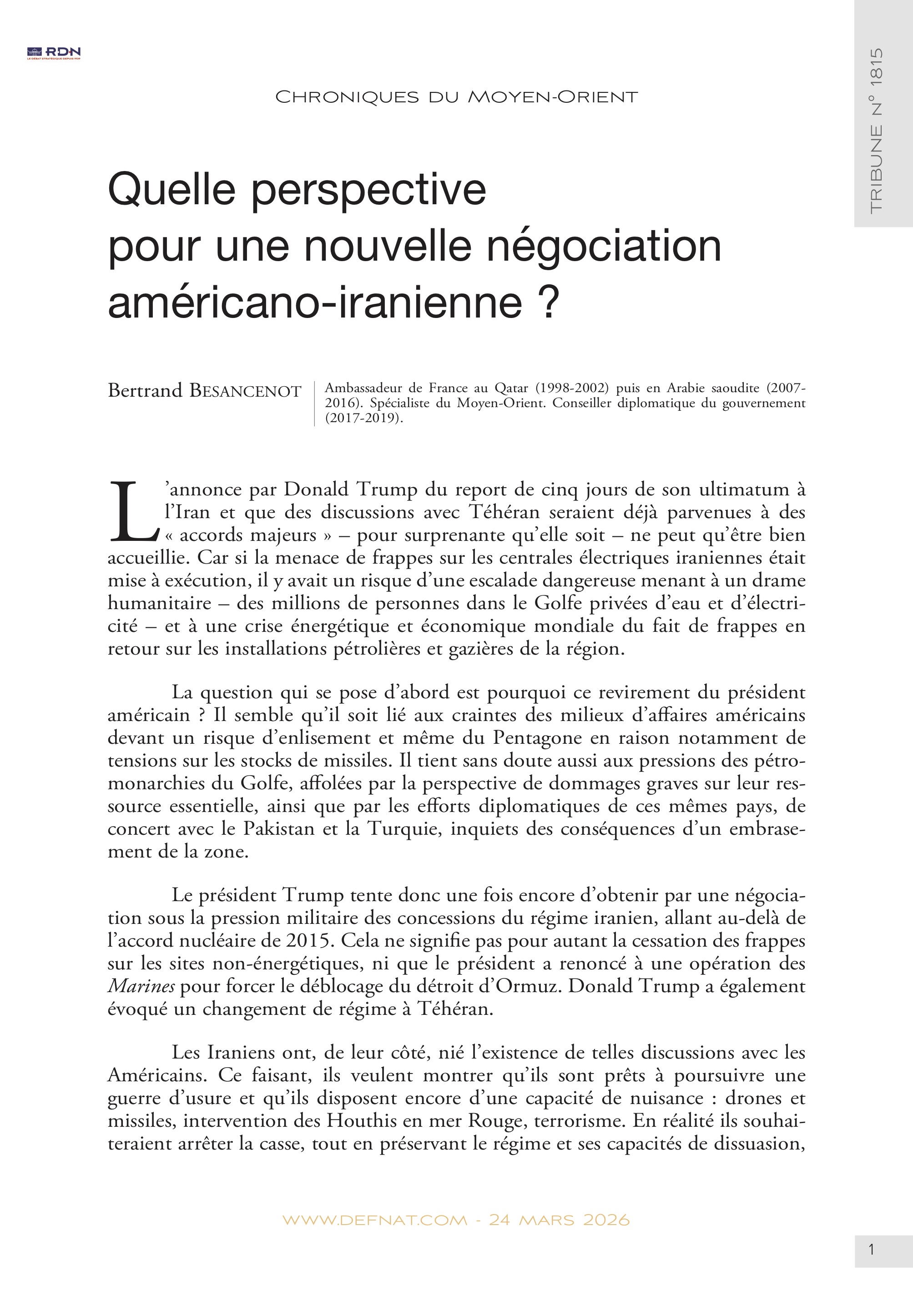 Chroniques du Moyen-Orient – Quelle perspective pour une nouvelle négociation américano-iranienne ? (T 1815)
