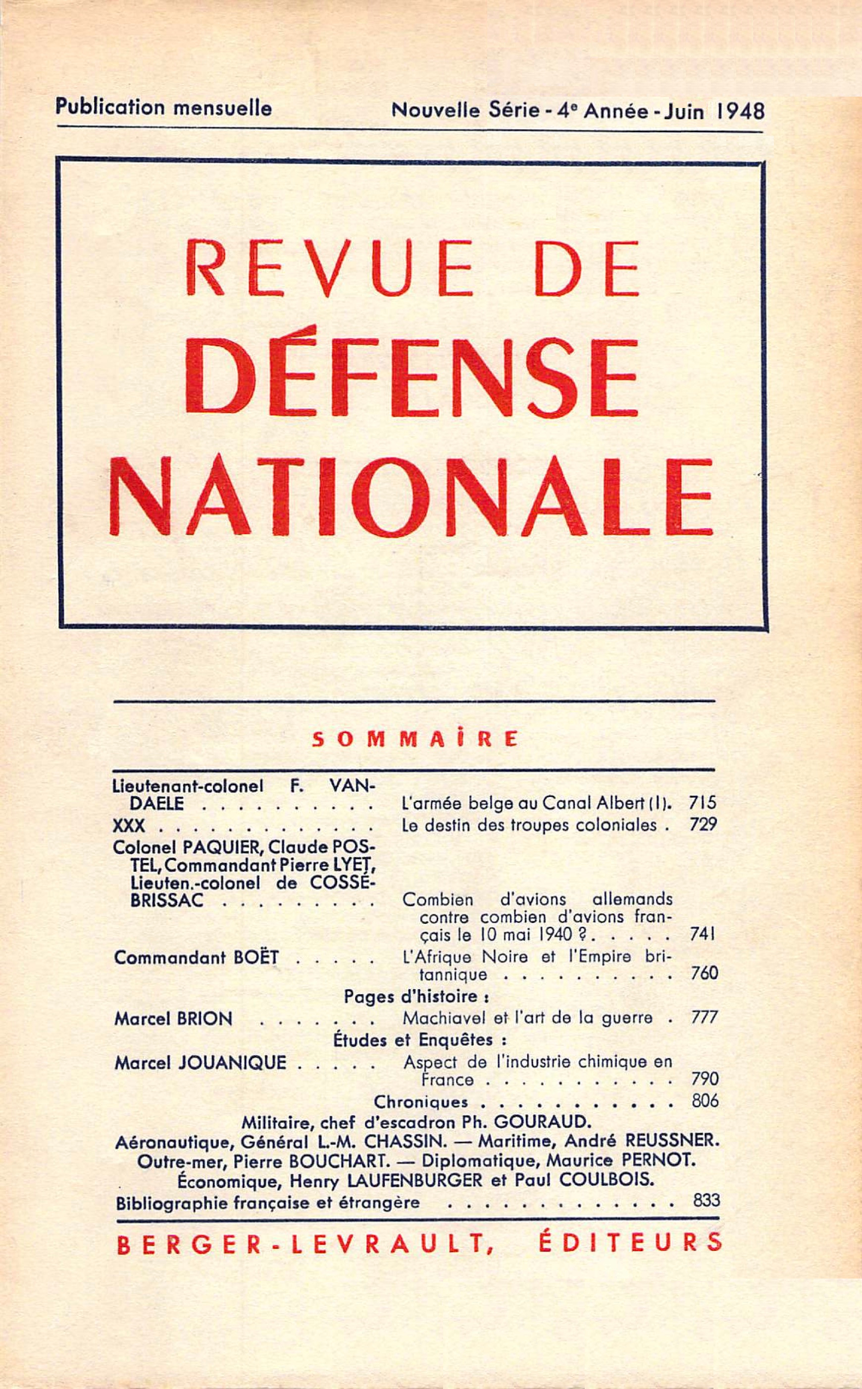 Il a paru intéressant à la Direction de la Revue de Défense nationale d’élucider l’important problème historique du rapport des forces aériennes allemandes et alliées pendant la campagne de l’Ouest en mai-juin 1940, problème qui fait encore et souvent l’objet de brûlantes contestations. Nous publions ici les conclusions auxquelles ont abouti, après une enquête approfondie effectuée aux meilleures sources, trois officiers supérieurs particulièrement qualifiés des armées de l’air et de terre. Lire les premières lignes