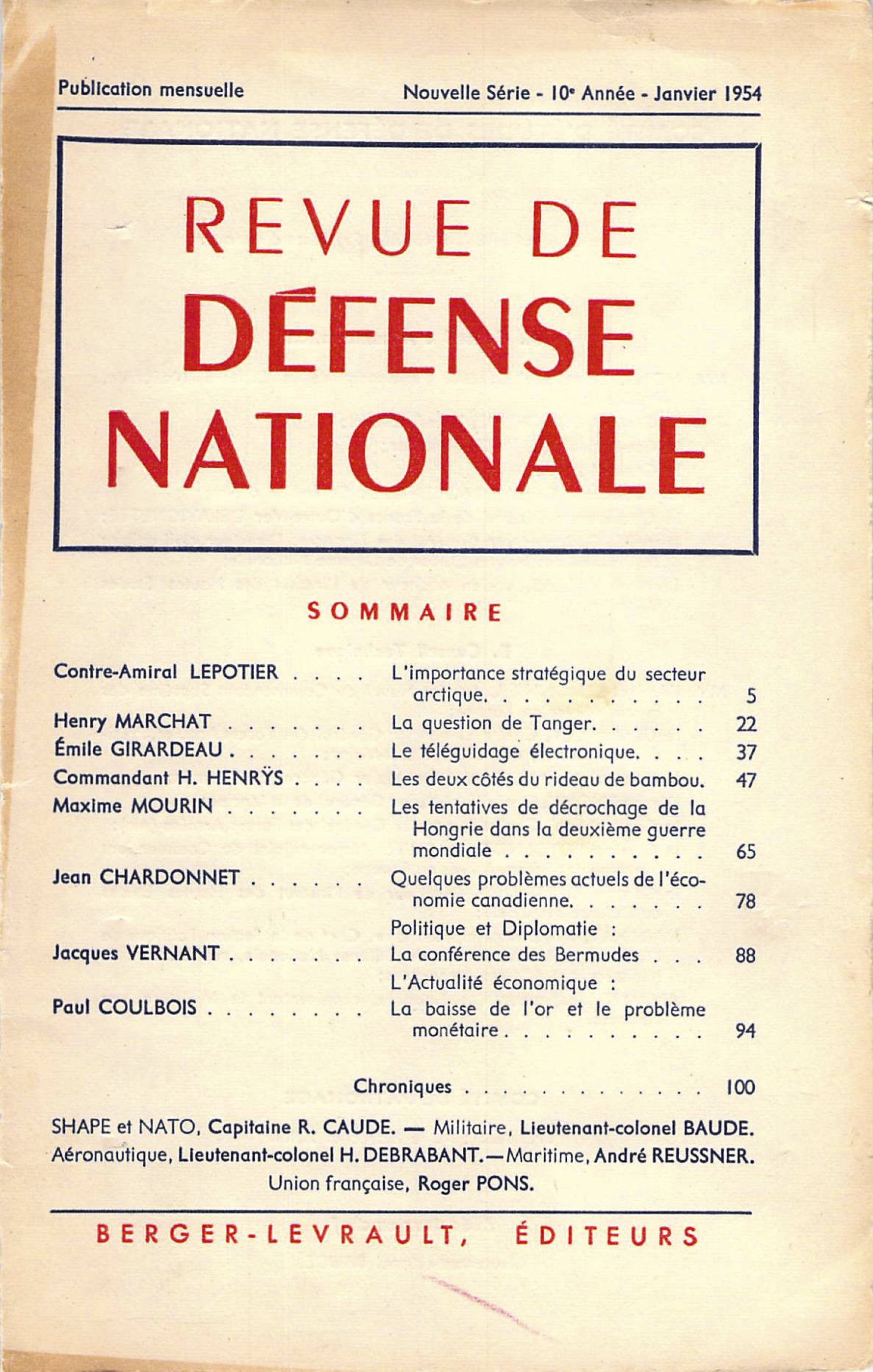 Depuis la dernière guerre mondiale, la presse quotidienne et les périodiques publient fréquemment sur l’Arctique des articles, dans lesquels la recherche d’une surenchère au sensationnel peut masquer les réalités stratégiques raisonnables découlant des données géographiques, politiques et techniques actuelles. C’est à un examen positif de ces données que nous nous proposons de procéder, en commençant, selon une méthode qui nous paraît fructueuse, par un « survol » rapide de cette région du monde, dont l’homme n’est parvenu que tout récemment à pénétrer les secrets. Lire les premières lignes