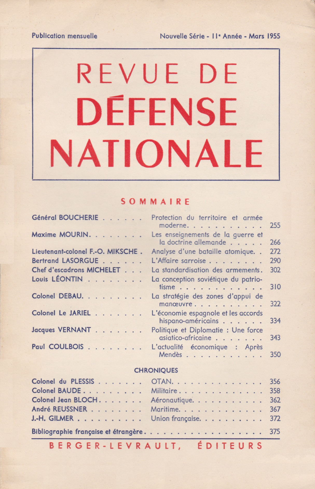 Au moment où une nouvelle armée allemande va se reconstituer, l’armée française doit elle-même subir une véritable reconversion. L’une et l’autre, pour tenir compte des éléments nouveaux, engins de guerre modernes et intégration dans une communauté atlantique, différeront considérablement des armées de 1945. Les revues militaires spécialisées traitent largement des transformations techniques nécessaires. Mais les changements ne seront pas seulement d’ordre matériel. Les publications allemandes font une large part à des questions qui figurent plus rarement au sommaire des revues françaises. Il ne s’agit pas seulement de l’aspect psychologique des choses de l’armée, du choix d’un mode de formation du soldat, de la mystique de la Soldatentum, mais de questions qui, pour n’être pas techniques, n’en sont pas moins plus concrètes. Si les problèmes de la rénovation militaire ne sont pas exactement identiques de part et d’autre du Rhin, peut-être n’est-il pas inutile de porter intérêt à certaines considérations exposées par les écrivains militaires de la République fédérale. Il ne saurait être question d’en faire ici un inventaire ou d’en dresser une bibliographie. Limitons-nous, à titre d’exemple, à un domaine où nous aussi pourrions trouver matière à d’utiles méditations. Lire les premières lignes