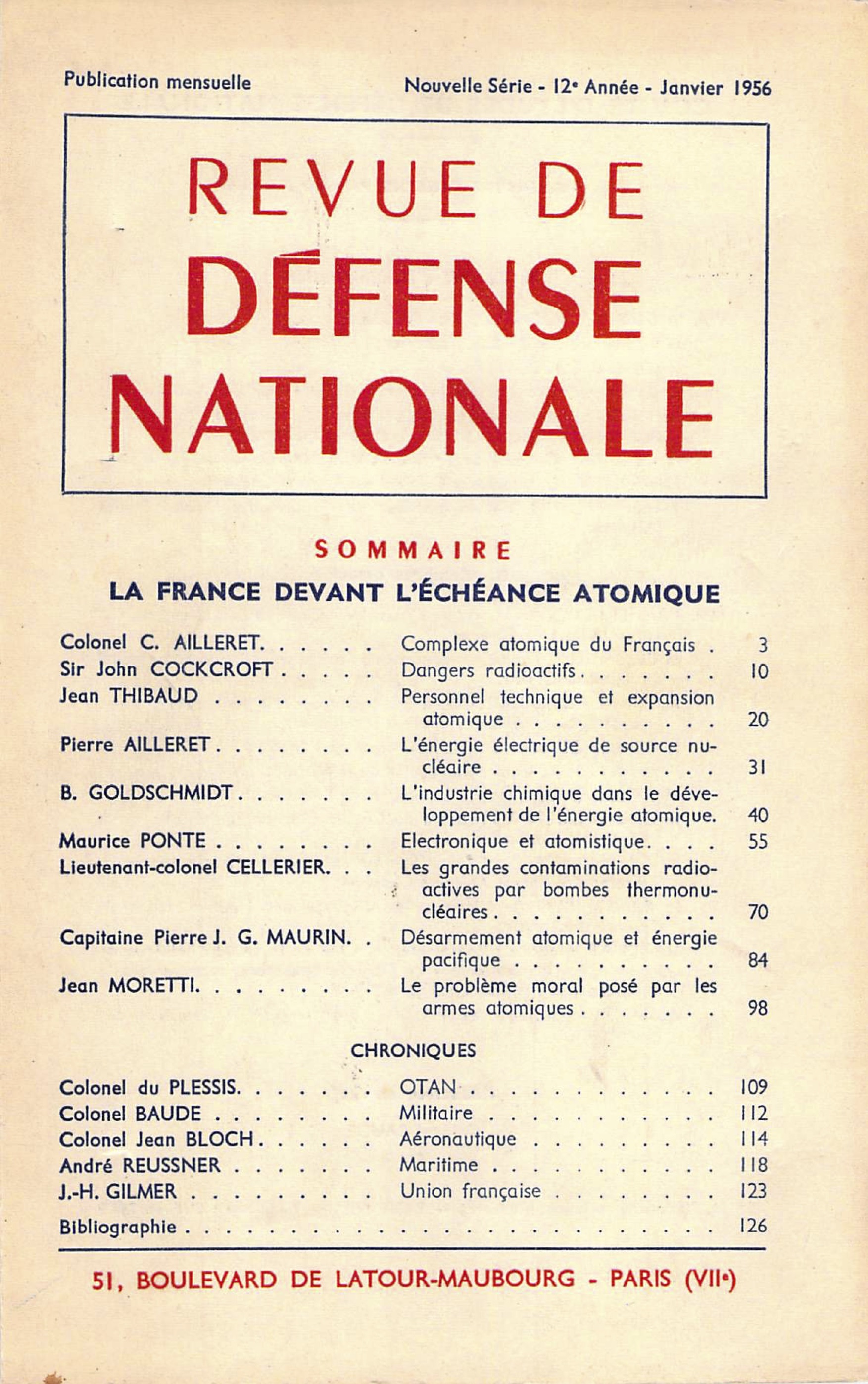 L’explosion d’une bombe atomique, le 6 août 1945, au-dessus d’Hiroshima, révéla au monde qu’une révolution intervenait dans les armements. Il s’agissait en effet du passage d’engins d’une puissance maximum d’une dizaine de tonnes de T. N. T. à une bombe dont la puissance était équivalente à 20.000 tonnes de T. N. T. soit un franchissement brutal dans les puissances marqué par le coefficient 2.000. Cette apparition soudaine ouvrait en même temps des vues sur les possibilités techniques et pacifiques de l’atome. Mais, après cette explosion spectaculaire qui paraissait avoir mis un point final aux hostilités, la course aux armements reprenait rapidement. Un nouveau recours à la physique nucléaire était fatal et bientôt il devenait évident qu’elle n’avait pas dit son dernier mot. La marche vers les engins de très grande puissance n’avait été qu’entamée. Lire les premières lignes
