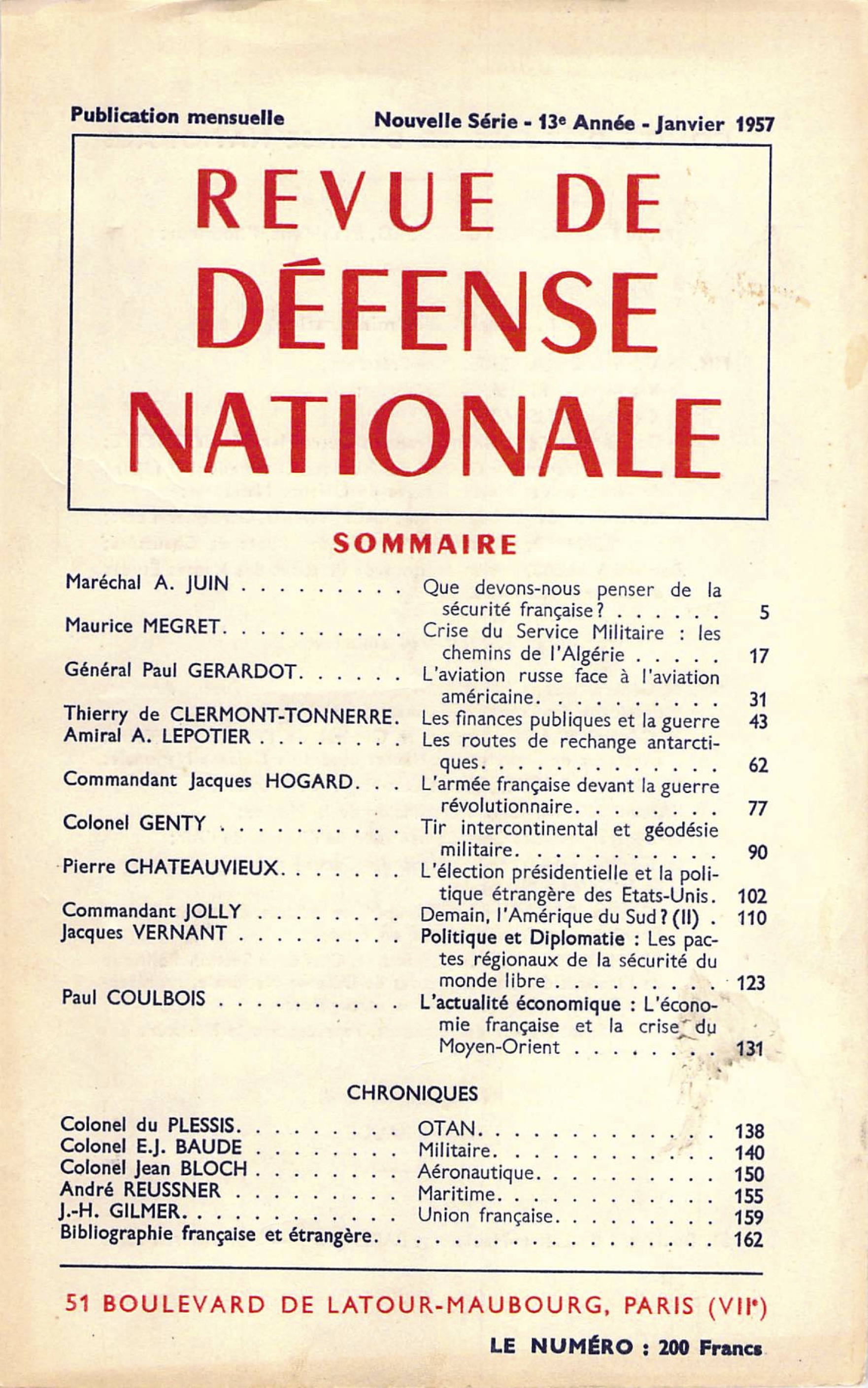 C’est la question qui se pose à la lumière d’événements récents qui semblent en avoir modifié certains éléments de base essentiels. Nul n’ignore qu’en matière de défense nationale les données du problème sont multiples et de tous ordres, vérifiées ou conjecturales, c’est-à-dire ayant forme d’hypothèses qu’on est bien obligé de se forger à soi-même pour asseoir un raisonnement et en déduire des solutions. Lire les premières lignes