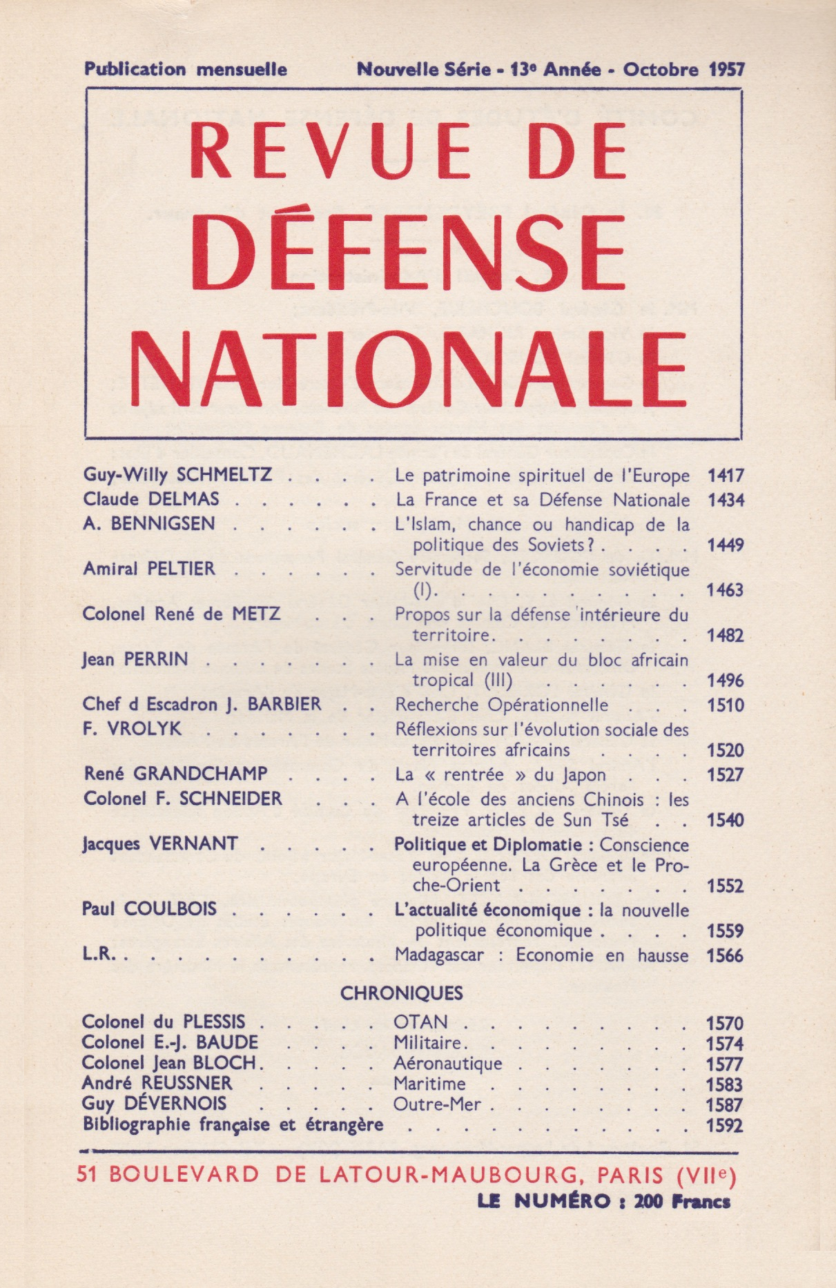 Dans le cadre de la lutte financière engagée par le Gouvernement, les crédits militaires ont été diminués, ce qui, à première vue, semblerait impliquer un affaiblissement de nos possibilités défensives. Or, dans le même temps, M. André Morice, ministre de la Défense Nationale, a annoncé que notre potentiel militaire ne serait pas affecté par ces restrictions, qui doivent être en quelque sorte « compensées » par des réformes permettant une répartition et une utilisation plus rationnelles des crédits disponibles. Mais ces réformes s'inséreront dans le plan mis au point par M. Bourgès-Maunoury au printemps, et qui demeure le cadre conceptuel de notre Défense. C'est pourquoi il nous a paru nécessaire d'« expliquer » la nouvelle politique militaire française, en nous efforçant d'en dégager les principes, les formes et les objectifs. Lire la suite