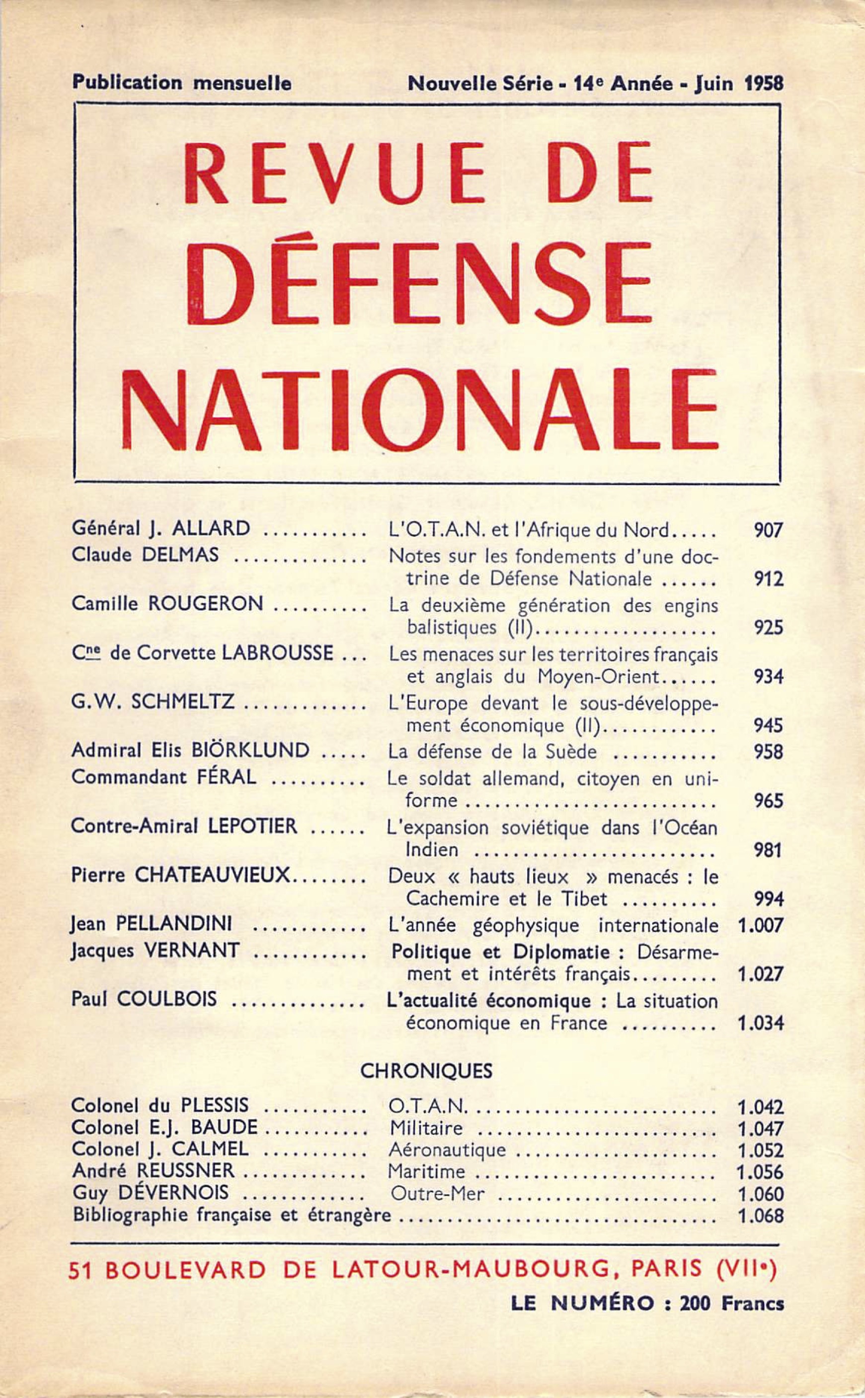 Il arrive souvent qu’un officier nouvellement affecté dans un des grands états-majors interalliés de l’OTAN pose la question suivante : Comment se fait-il que le champ d’action de la stratégie alliée soit limité au Sud par la Méditerranée ? Rien ne semble prévu dans les plans de la défense pour faire face à un encerclement de l’Europe par l’Afrique du Nord. L’ennemi éventuel, le Russe, ne peut-il — répugnant aux risques d’une guerre totale — réaliser cet encerclement indirectement, en favorisant l’éclosion de conflits limités, de subversions internes, dans le but d’éliminer l’influence occidentale et d’amener par étapes sous son obédience des peuples sous-développés qu’une indépendance trop tôt accordée livrera sans défense au marxisme ? Lire les premières lignes