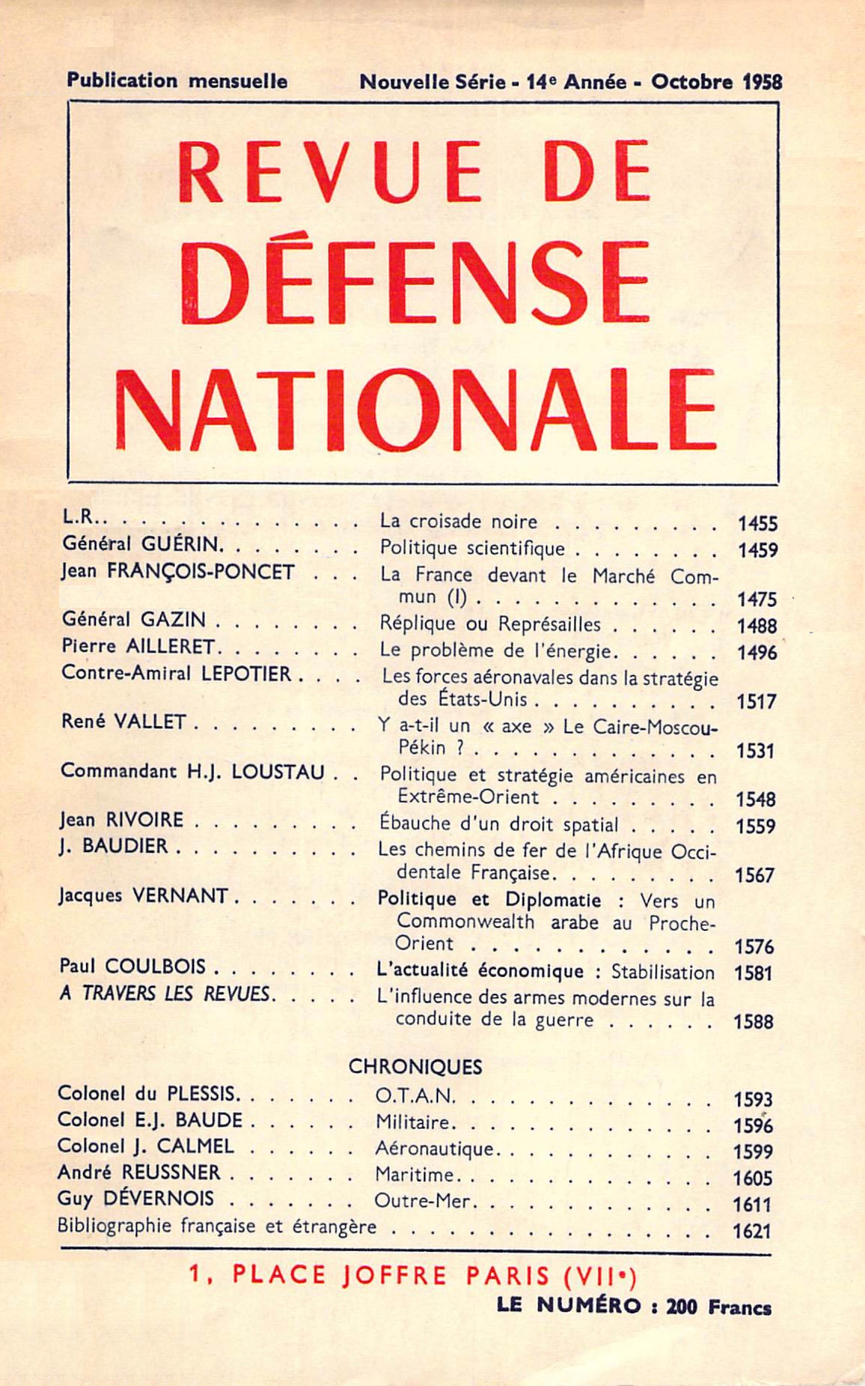 Si un livre devait frapper l’opinion et bousculer les idées admises, c’est bien celui-là. L’auteur en effet y démontre que l’apparition des fusées à longue portée a complètement transformé les données stratégiques courantes et par conséquent rendu caduques les conceptions traditionnelles des états-majors. On peut admettre, nuancer ou rejeter cette thèse ; on sera tout de même impressionné par elle, et par les arguments sur lesquels elle s’appuie. Lire la suite
