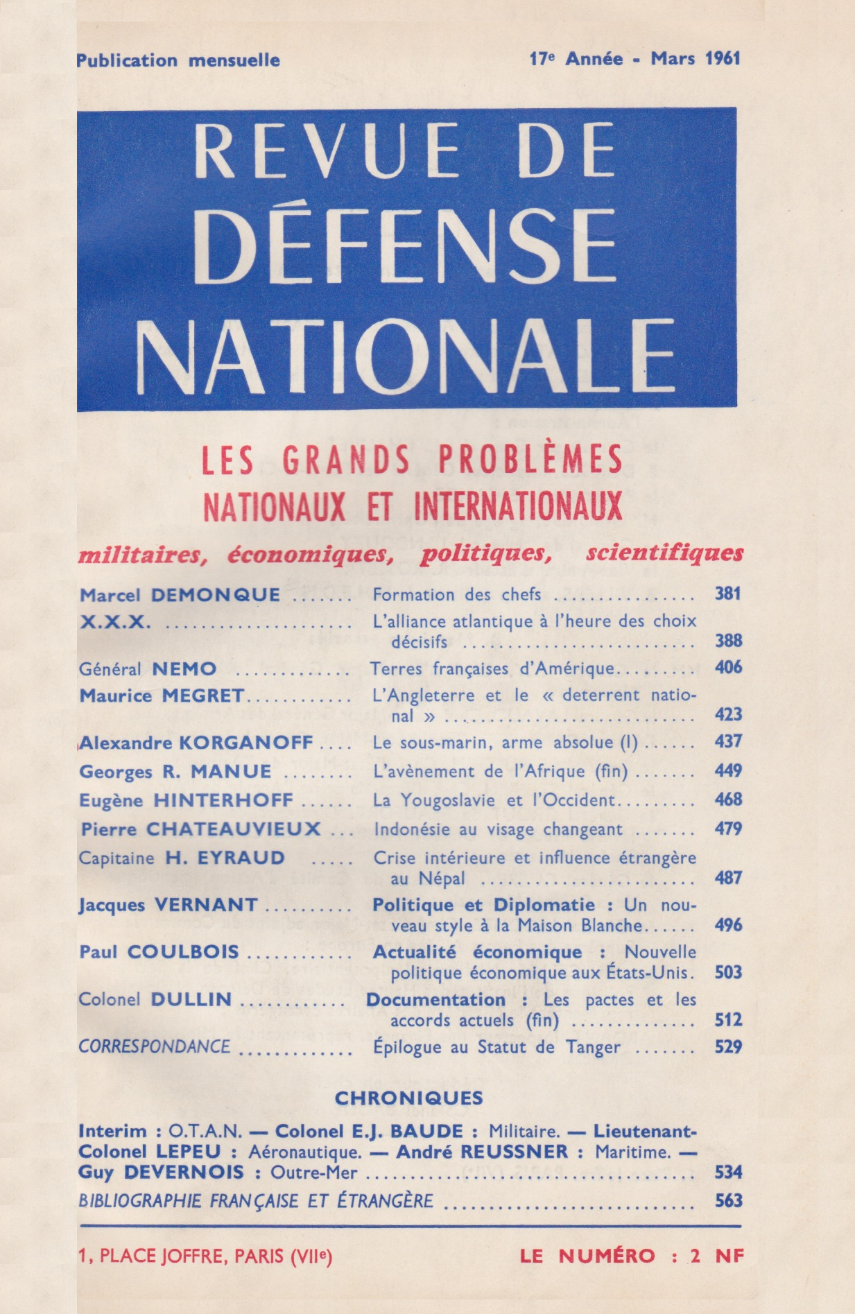 M. Raymond ARON intitulait un de ses récents articles : « L’Alliance Atlantique s’interroge ». Cette formule traduit bien l’ambiance générale des réunions de la fin de l’année 1960 : Conférence des Parlementaires de l’OTAN, Comité Militaire, Conseil Atlantique — et celle dans laquelle s’est ouverte l’année 1961. Et ces interrogations, qu’elles aient pour objets l’armement atomique, le renforcement du Conseil Atlantique ou les problèmes économiques, ne portent sur les moyens qu’en apparence. En réalité, elles portent sur les fins. Lire les premières lignes
