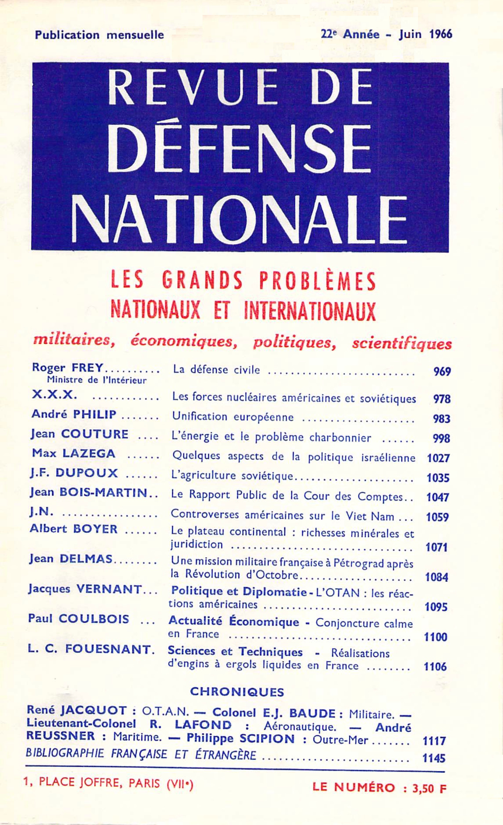 Dans son numéro de mars 1965 (chronique militaire) la Revue de Défense Nationale publiait un tableau comparatif des forces nucléaires américaines et soviétiques. Le rapport de ces forces s’établissait de 4 à 1 en faveur des États-Unis. Depuis cette époque, des efforts ont été accomplis de part et d’autre, dans des sens d’ailleurs très différents. Il nous a donc paru intéressant de montrer par le tableau ci-après la nouvelle situation des armements atomiques américains et soviétiques, telle qu’elle se présente à cette époque de l’année 1966. Lire les premières lignes